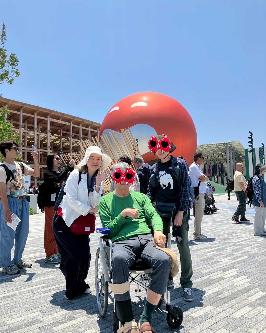普段とは勝手が違う部分に戸惑うことも少々ありましたが、私が持参した「タコやんサングラス」かけていただけたり、徐々に笑顔も増え、和やかに万博のエスコートを終えることができました。